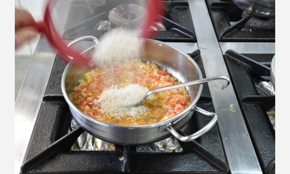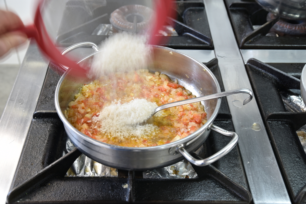 Soğanlar kavrulunca doğranmış domates içlerini ilave edip iyicesuyunu uçurup kavurun. Islanmış pirinci ilave edin ve tuzunu serpin, tane tane olana kadarkavurmaya devam edin,