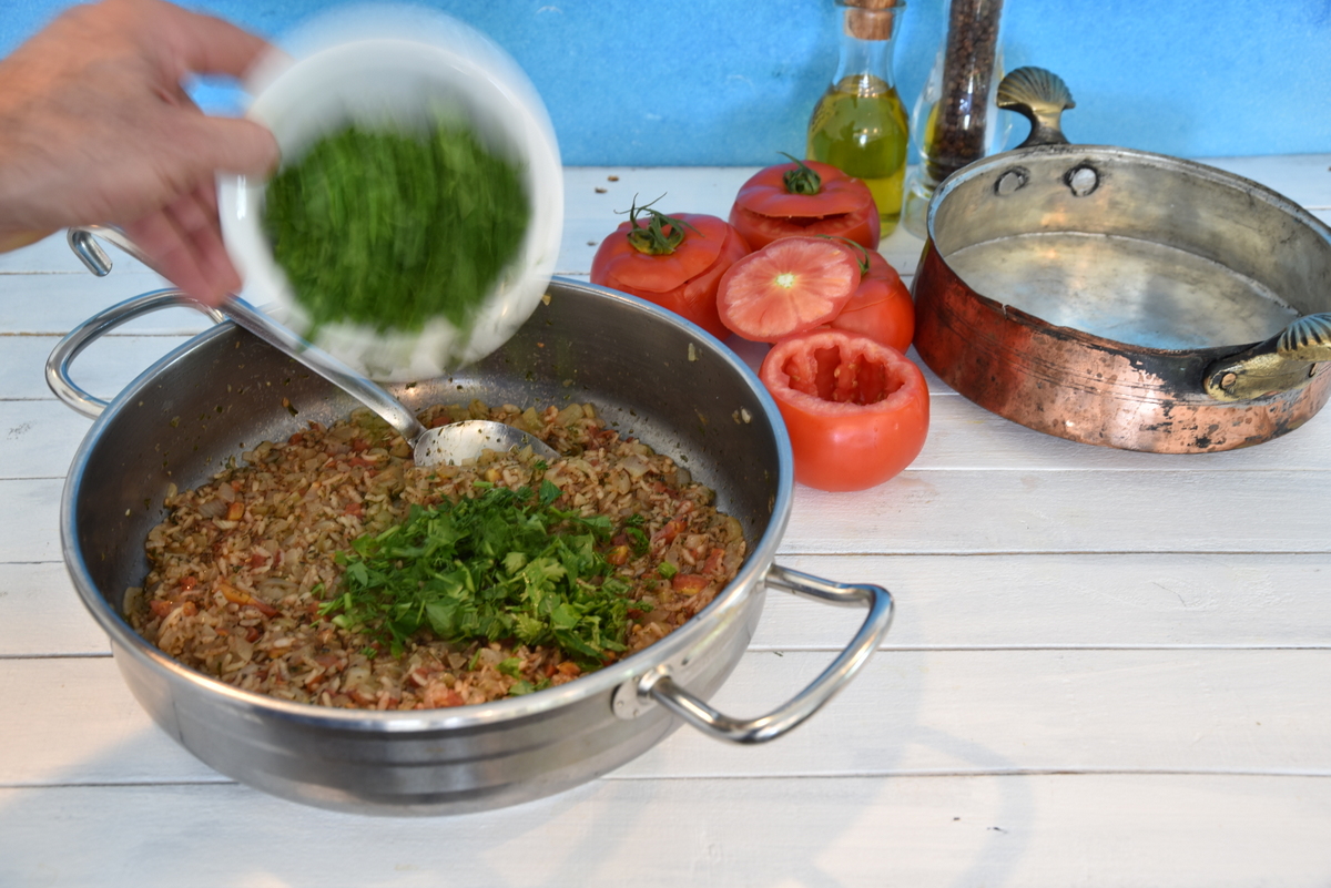 15 dk. sonra ince doğranmış maydanoz ve dereotu ile karıştırıpdomateslere doldurun ve kapaklı uygun bir kaba koyun. Yarım çay bardağı su ilave edip üzerine kalan zeytin yağını