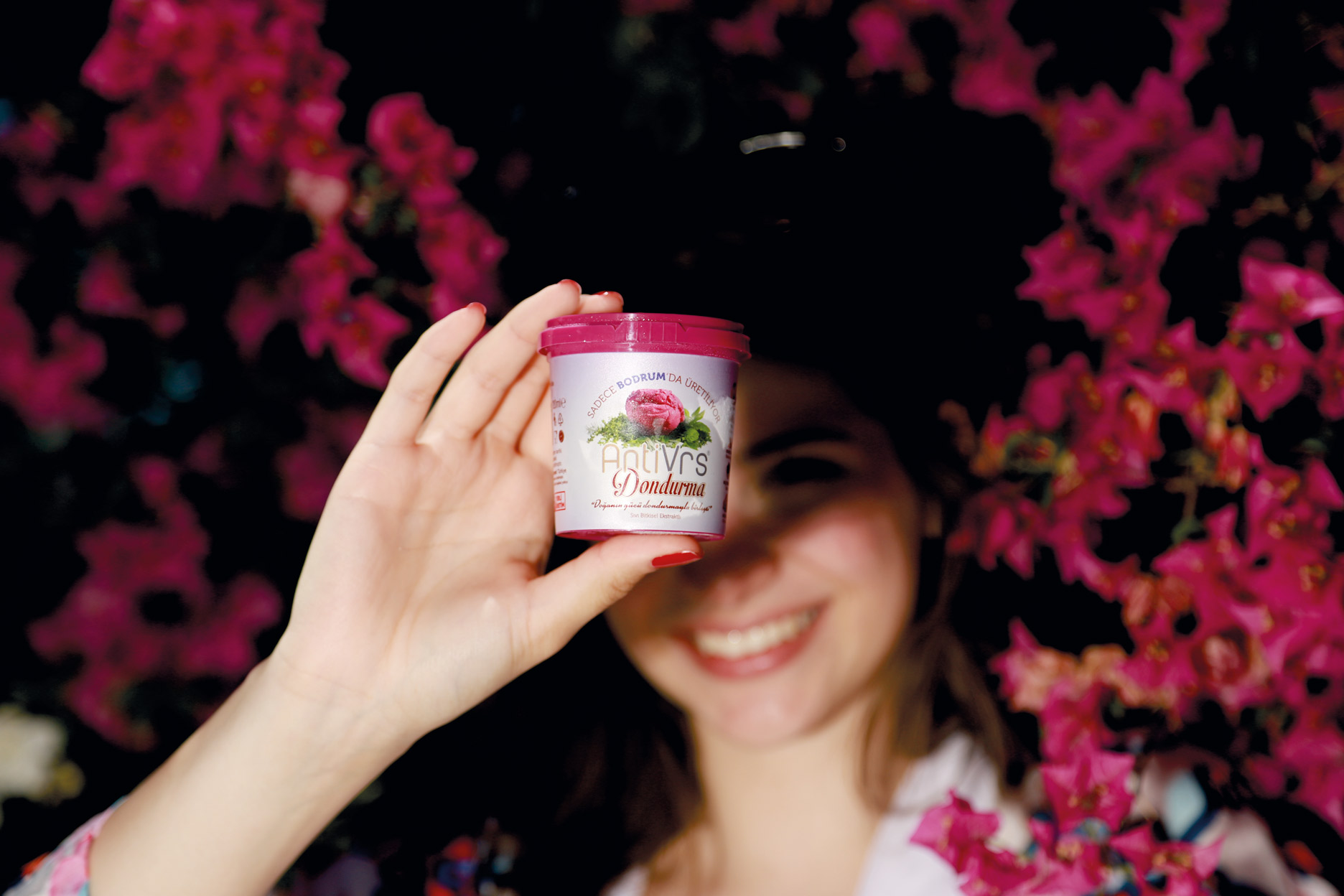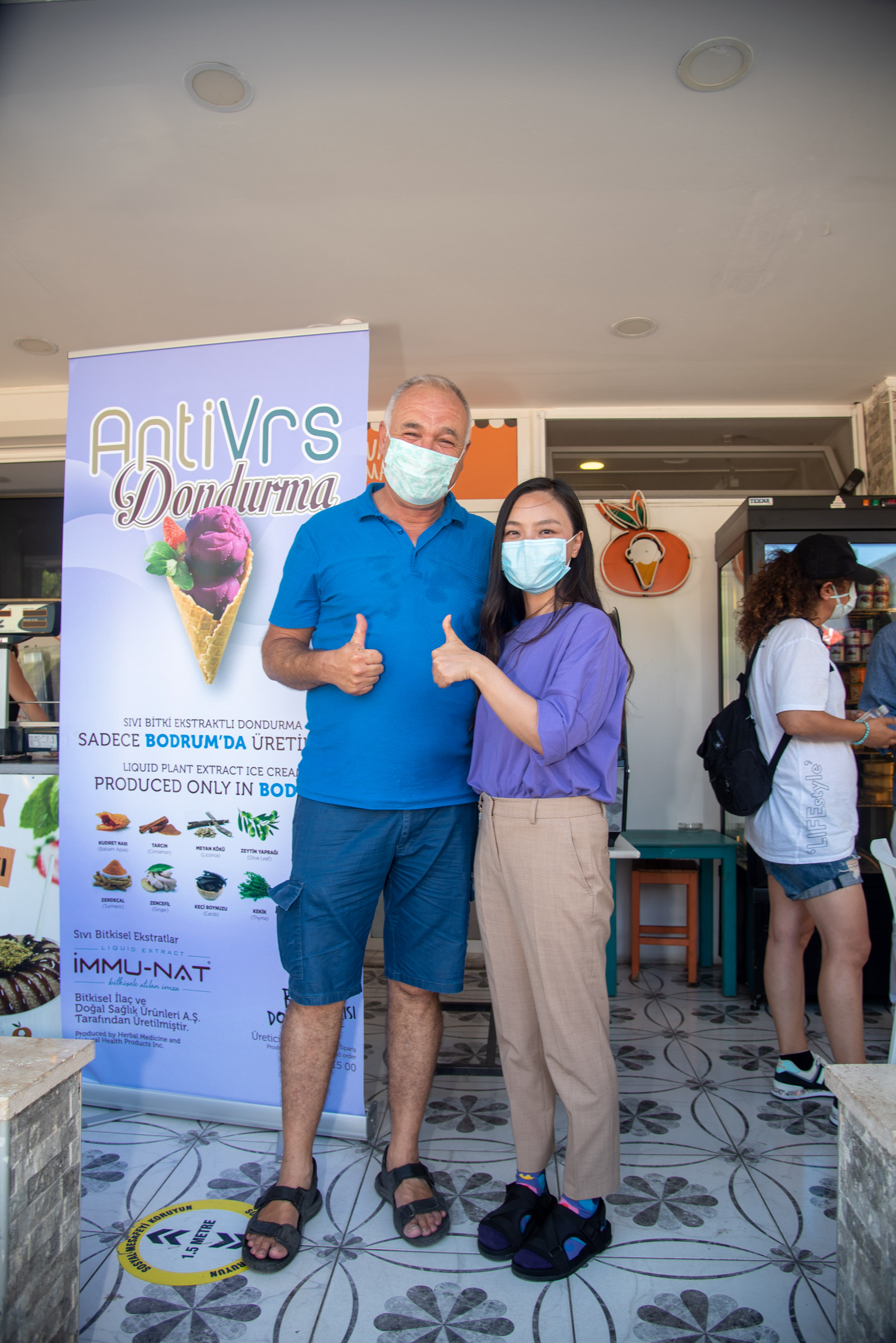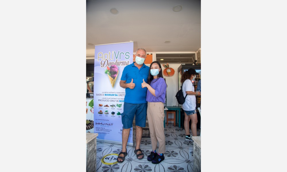 Salgın ile birlikte yöremizde yetişen ve yüzyıllardır kullanılan şifalı otları sentez ederek dondurmaya dönüştürmeyi düşündük. Fikir İmmunat Firması sahibi Adnan Akar’dan geldi. Bitki özütleri çıkaran firma; doktorlar, gıda mühendisleri ve üniversitelerle uzun süreli bir labaratovar çalışması yaparak zencefil, zerdeçal, meyan kökü, tarçın, karanfil, kırmızı pancar, zeytin yaprağı, keçi boynuzu, kudret narı ve kekik bitkilerinin ekstratlarını üretip bize teslim etti. Bitki ekstratları, süt, sahlep ve çok az miktarda şeker kullanarak Bodrum AntiVrs dondurmasını ürettik. Bitkisel içeriği sayesinde antivirüs etkiye sahip dondurma aynı zamanda besin değeri yüksek bitki özütleriyle de bağışıklık sistemini desteklemeye yardımcı oluyor.