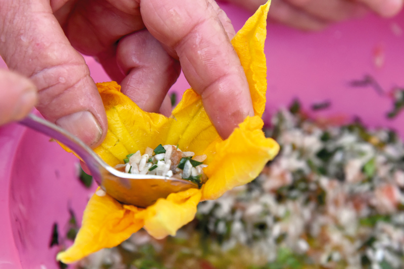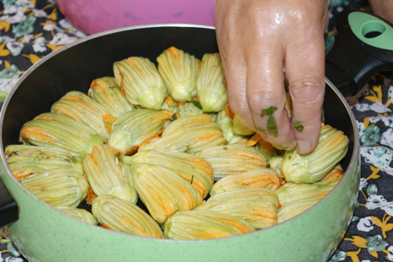 Kabak çiçekleri sabahın erken saatlerinde dalından toplanmalıdır. Havanın ısınması ve günün ilerlemesiyle birlikte çiçek büzülüp kapandığından günün erken saatlerinde toplamakta fayda var. Diğer yandan karışım için pirinç iyice yıkanıp süzüldükten sonra bir kaba alınır. Soğan ve domates ince ince kıyılır. Dereotu, maydanoz, taze nane de doğrandıktan sonra karışıma 1 tatlı kaşığı tuz ve zeytinyağı ilave edilip karıştırılır.