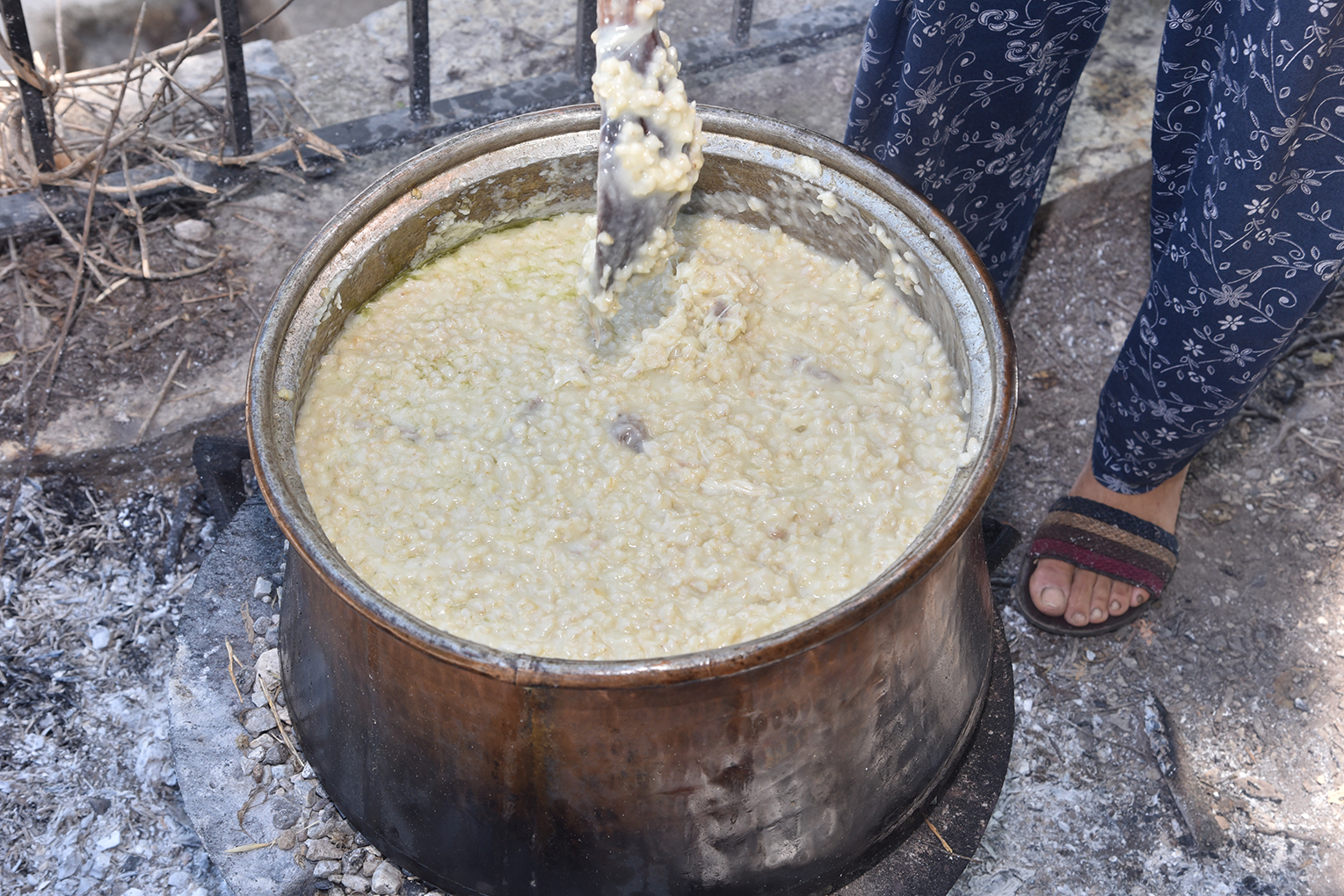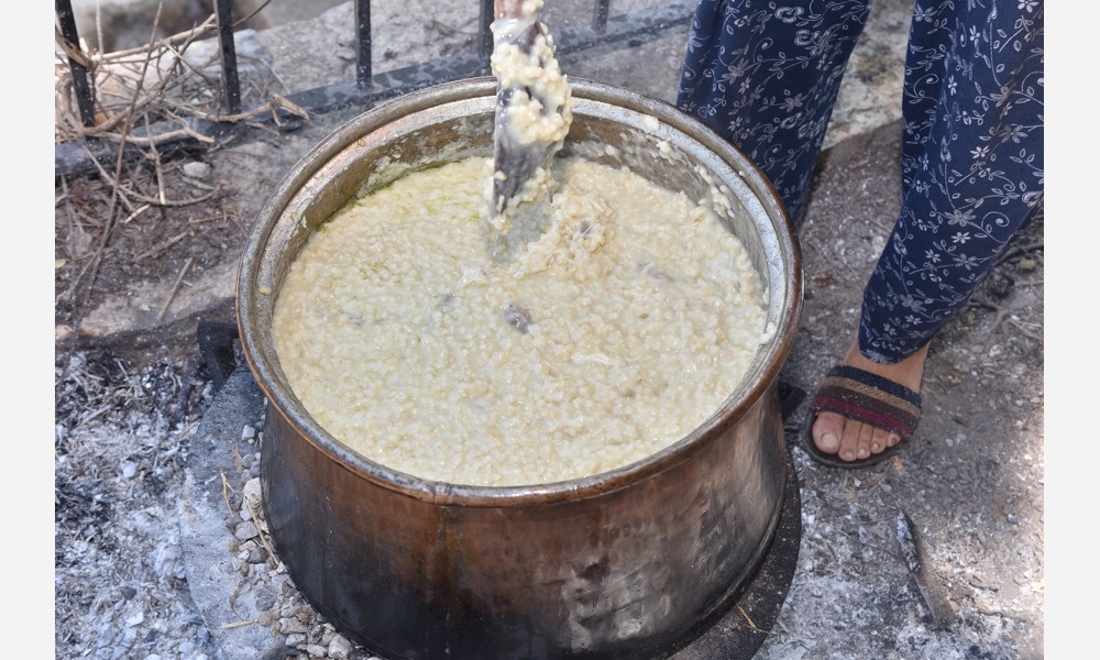 Odun ateşinde büyük kazanlarda yapılan meşhur keşkeğin ana besin maddesi yarma buğday, et ve zeytinyağından oluşuyor. Gerisi güçlü kollara ve tahta kepçeye kalıyor. İşin özü oldukça zahmetli bir yemek keşkek.